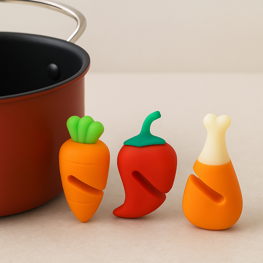 Voorkom overkoken met deze leuke siliconen dekselhefters. Met vormen zoals wortel, peper en kippenpoot houden ze het deksel iets omhoog waardoor stoom ontsnapt en de kookpot niet overloopt.