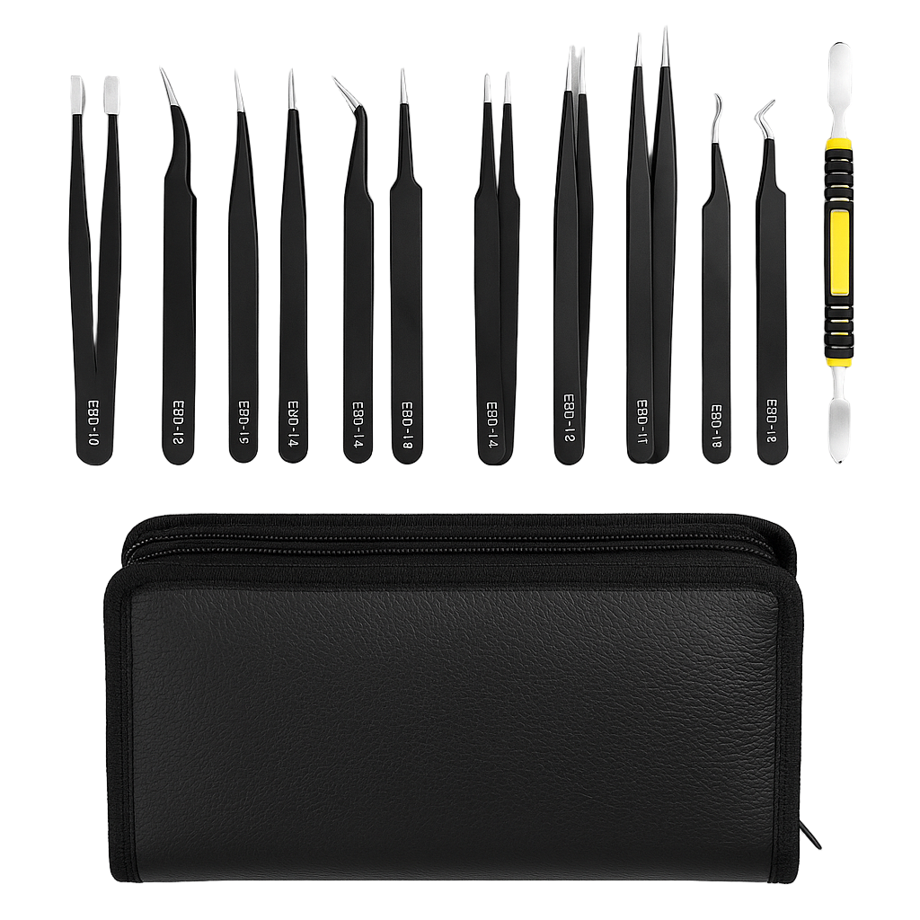Deze 12-delige pincetset biedt nauwkeurige grip en controle voor elektronica, ambacht en onderhoud. Inclusief stevige opbergtas voor gemakkelijk gebruik.